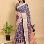 Artistic Navy & Copper Floral Linen Cotton Saree