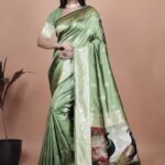Avantini Elegant Sage Green Banarasi Silk Saree with Majestic Peacock Pallu With Unstitched Blouse Piece