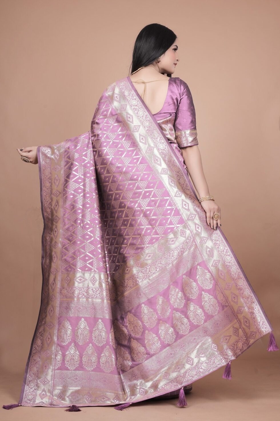 Avantini Lavender Banarasi Silk Saree with Silver Zari Geometric and Floral Design With Unstitched Blouse Piece