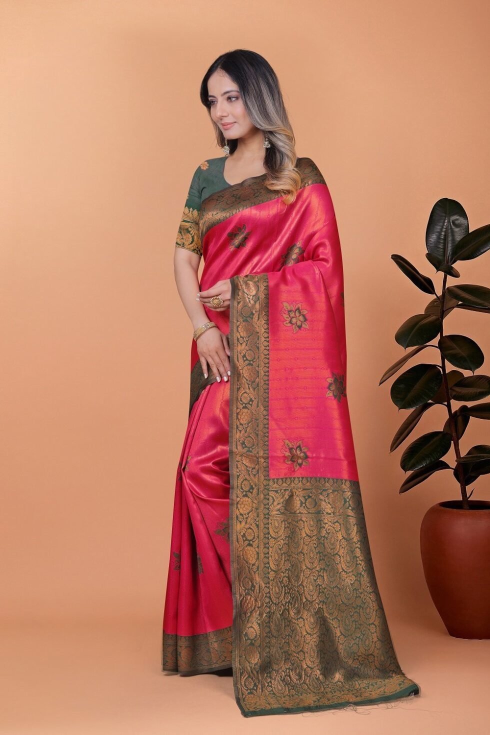 Avantini Rose Ruby Antique Zari Weave Banarasi Silk Saree with Unstitched Blouse Piece