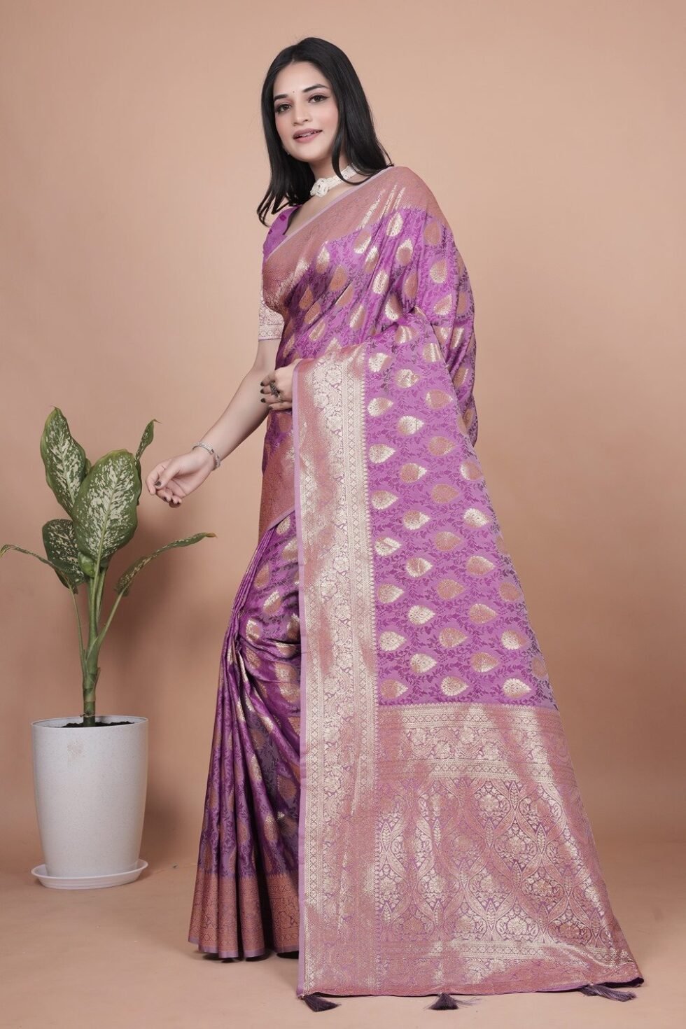Avantini Royal Purple Banarasi Silk Saree with Golden Zari Butta Weaving With Unstitched Blouse Piece