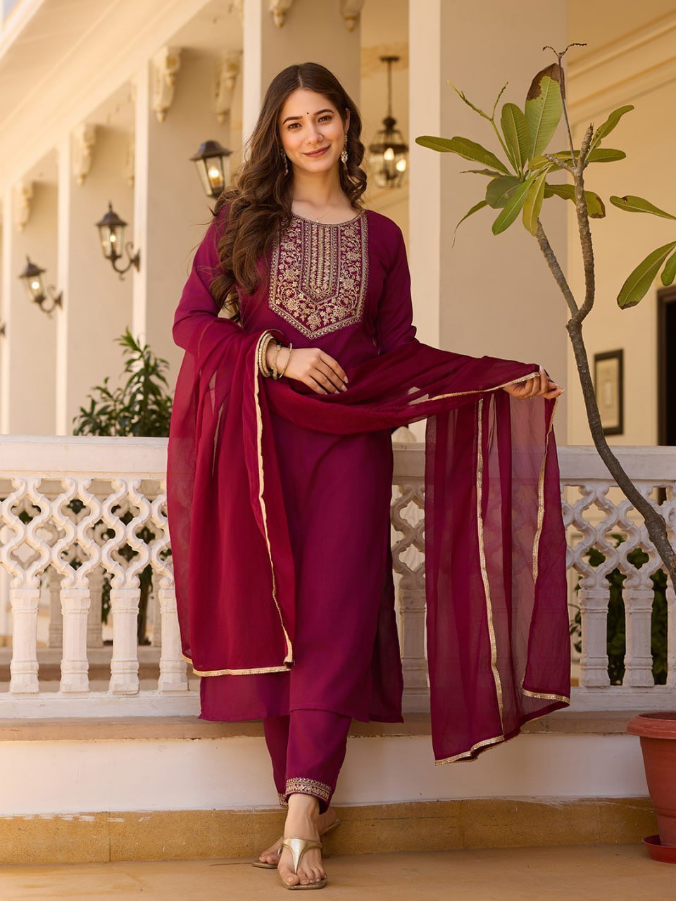 Avantini Women’s Beige Rayon Embroidered Straight Kurta Pant With Dupatta