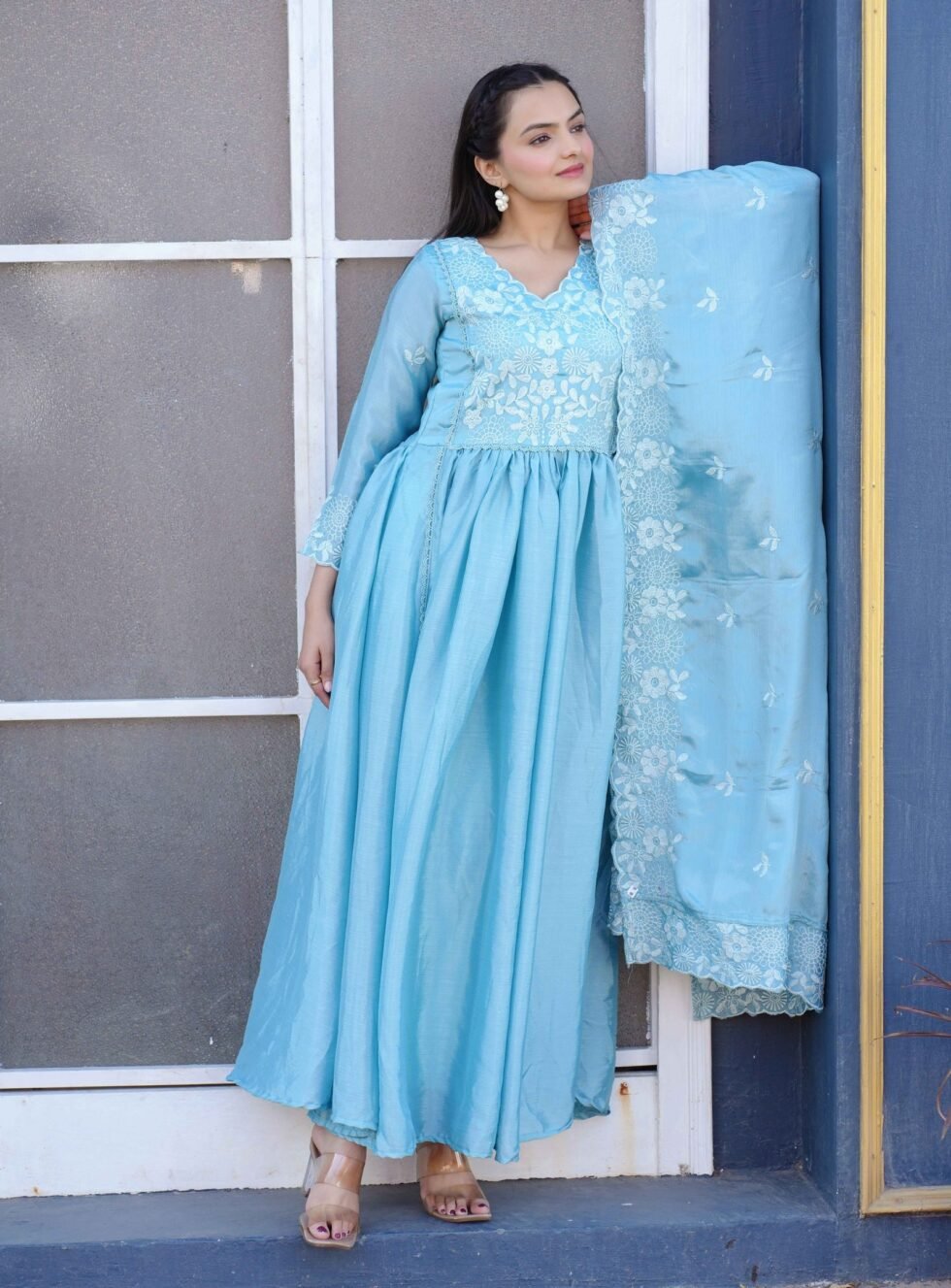 Avantini Women’s Blue Chinon Sequence Anarkali Kurta Pant With Dupatta