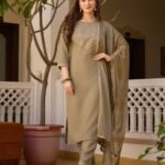 Avantini Women’s Brown Cotton Silk Embroidered Straight Kurta Pant With Dupatta