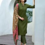 Avantini Women’s Cotton Dark Green Emblished Kurta Pant With Dupatta