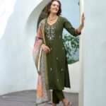 Avantini Women’s Cotton Dark Green Embroidered Kurta Pant With Dupatta