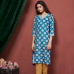 Avantini Women’s Cotton Linen Sky Blue Printed embellished Bandhani Kurti