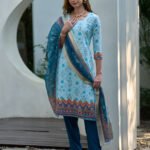 Avantini Women’s Cotton Sky Blue Floral Printed With Chikankari Embroidered Kurta Pant With Dupatta