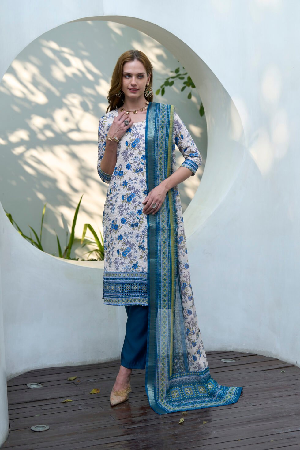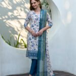 Avantini Women’s Cotton White Blue Floral Printed With Chikankari Embroidered Kurta Pant With Dupatta