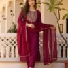 Avantini Women’s Maroon Rayon Embroidered Straight Kurta Pant With Dupatta