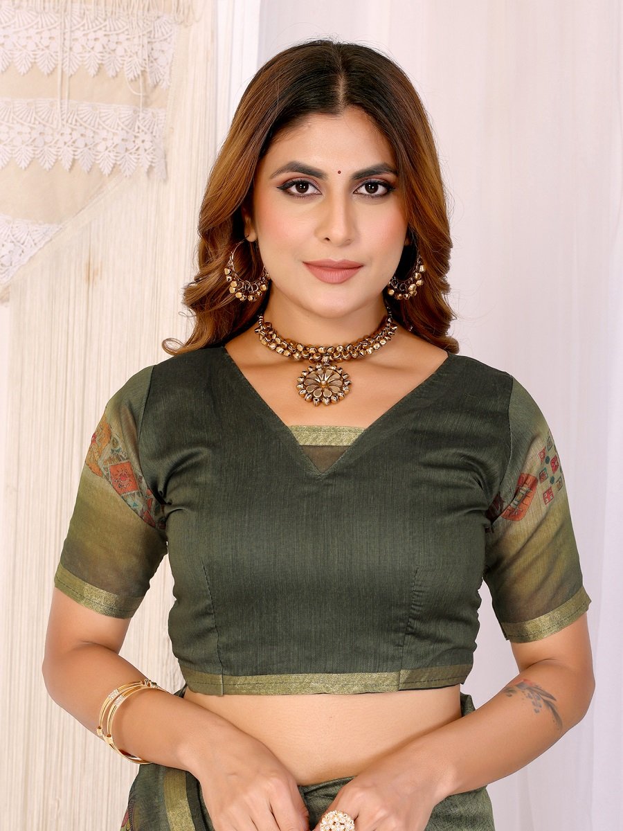 An elegant olive green Chanderi saree designed with subtle woven texture and highlighted by traditional multicolor geometric border. The contrast border work enhances its ethnic charm, making it stand out effortlessly.