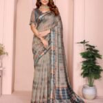 This elegant saree is crafted in Black Chanderi fabric with a soft grey base and rust-beige patterned digital prints, giving it a refined and stylish appeal. The overall design carries a subtle tribal-inspired touch, perfect for women who like unique yet graceful drapes.