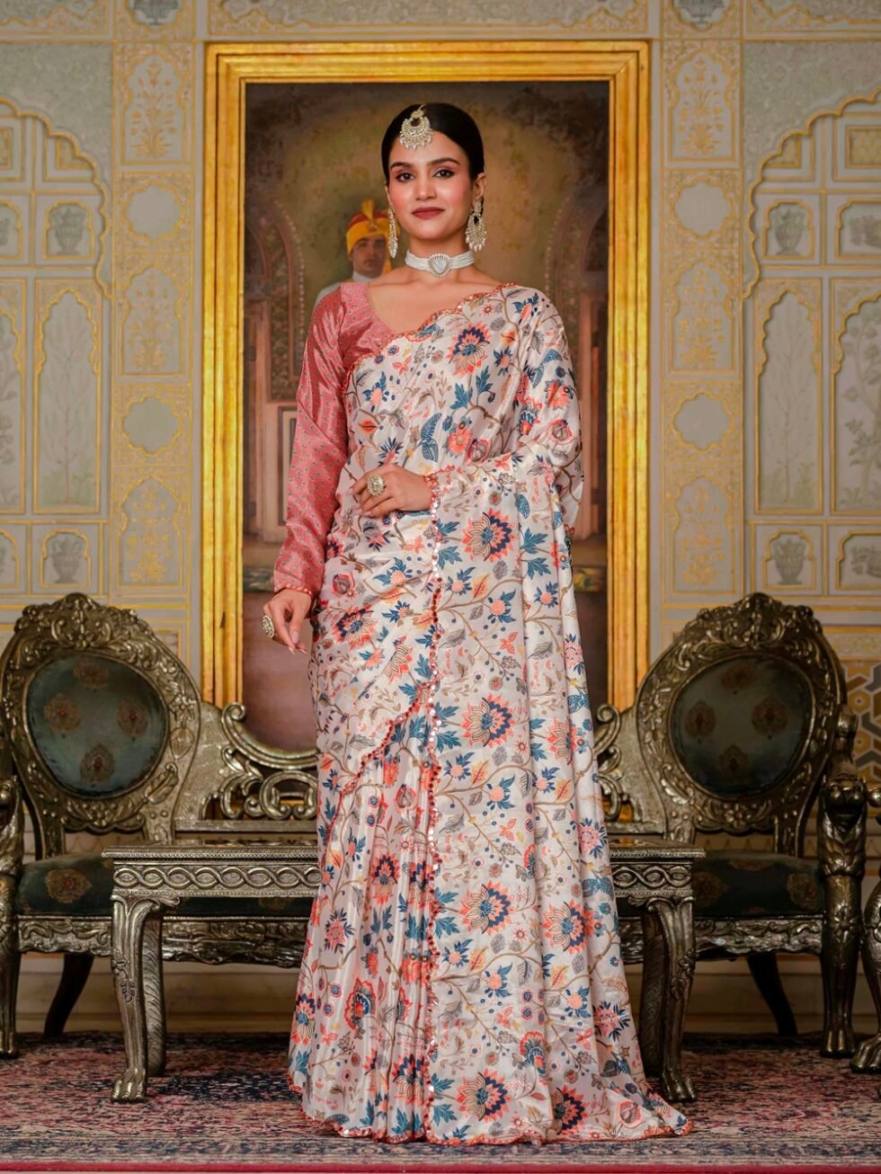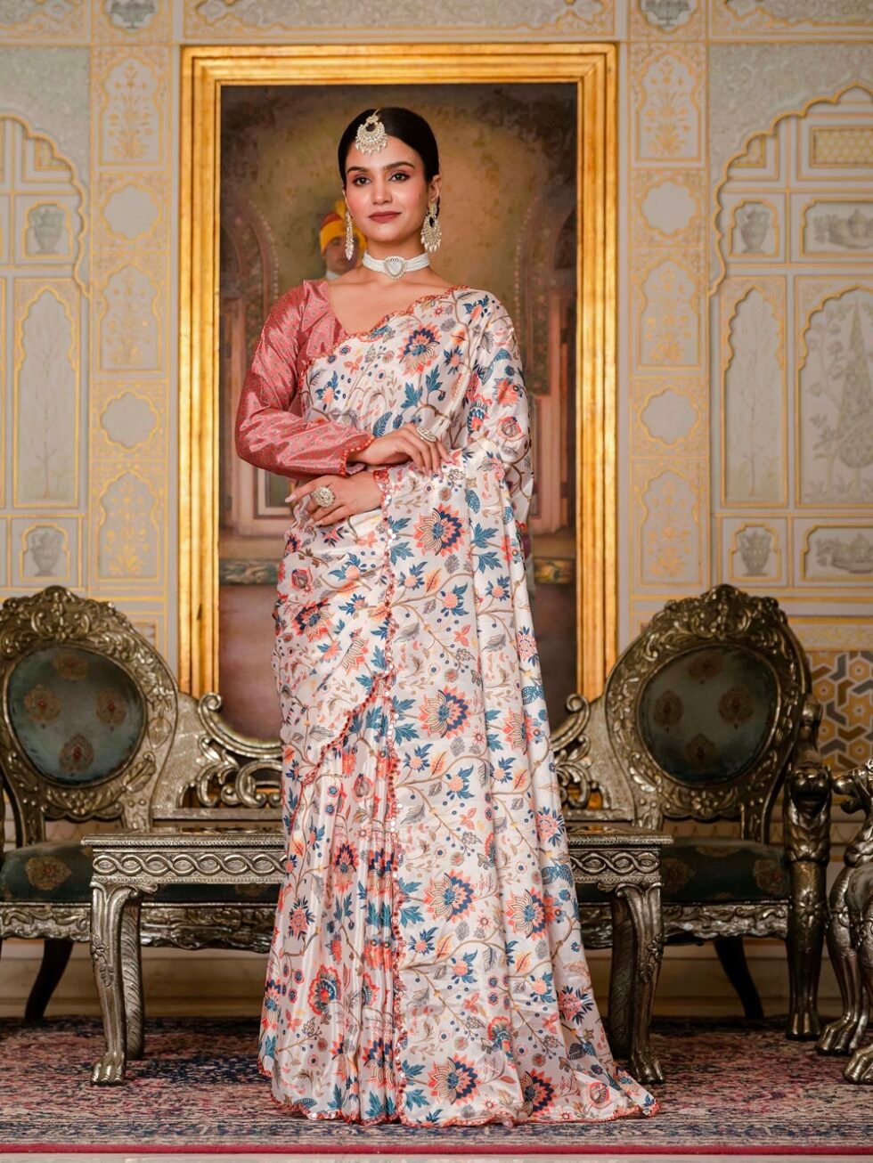 Chinon Digital Print Ready To Wear Saree With Blouse Piece