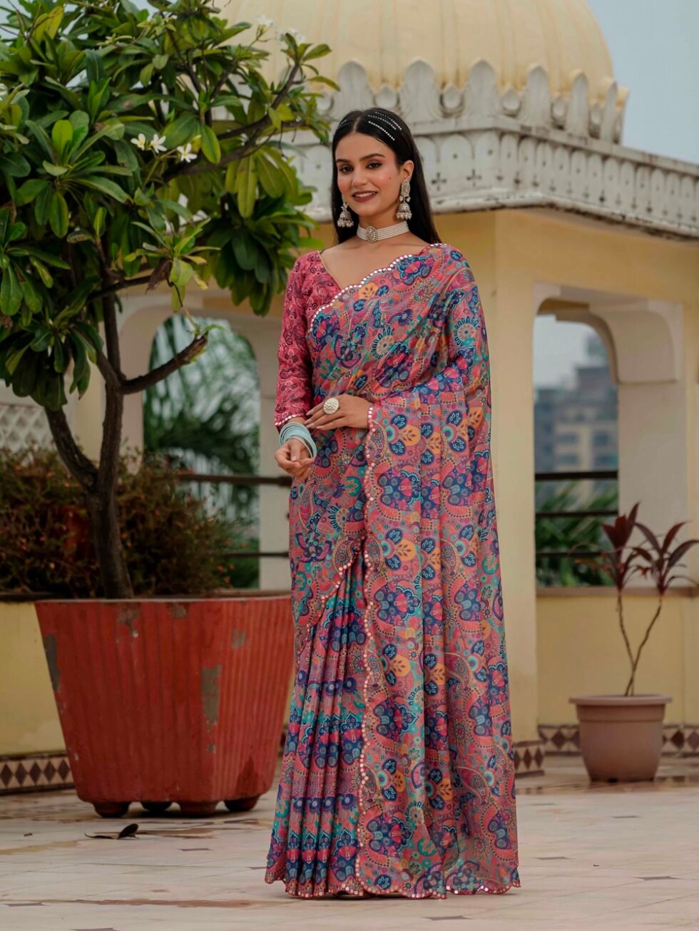 Chinon Digital Print Ready To Wear Saree With Blouse Piece