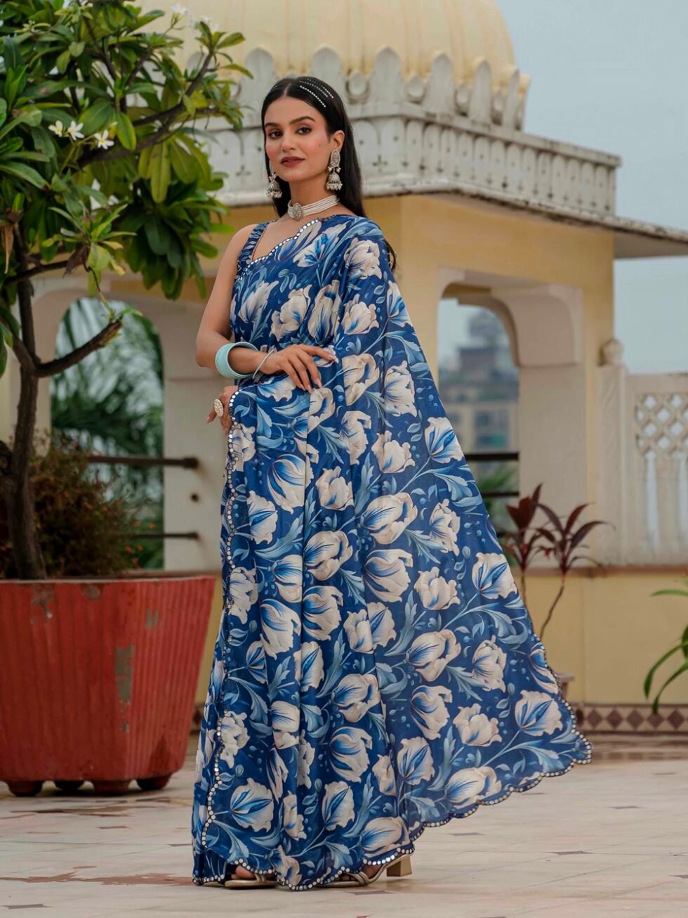Chinon Digital Print Ready To Wear Saree With Blouse Piece
