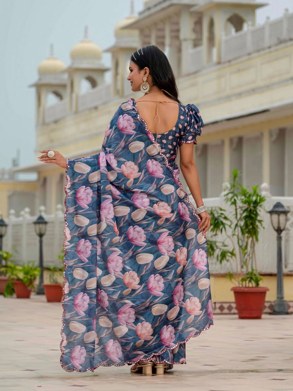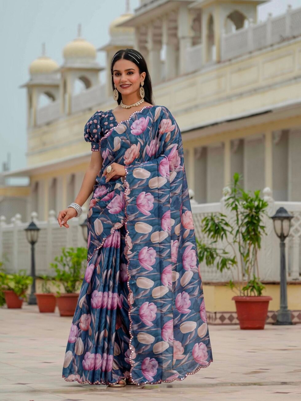 Chinon Digital Print Ready To Wear Saree With Blouse Piece