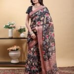 Make a striking, sophisticated statement in this dramatic Black/Deep Navy Saree. Crafted from the Jacquard Patta Linen Cotton fabric, this piece features a dark, powerful base colour that makes the print truly pop. The body is covered in a lush, large-scale digital floral print featuring shades of red, pink, and white, creating a gorgeous contrast.