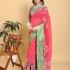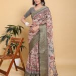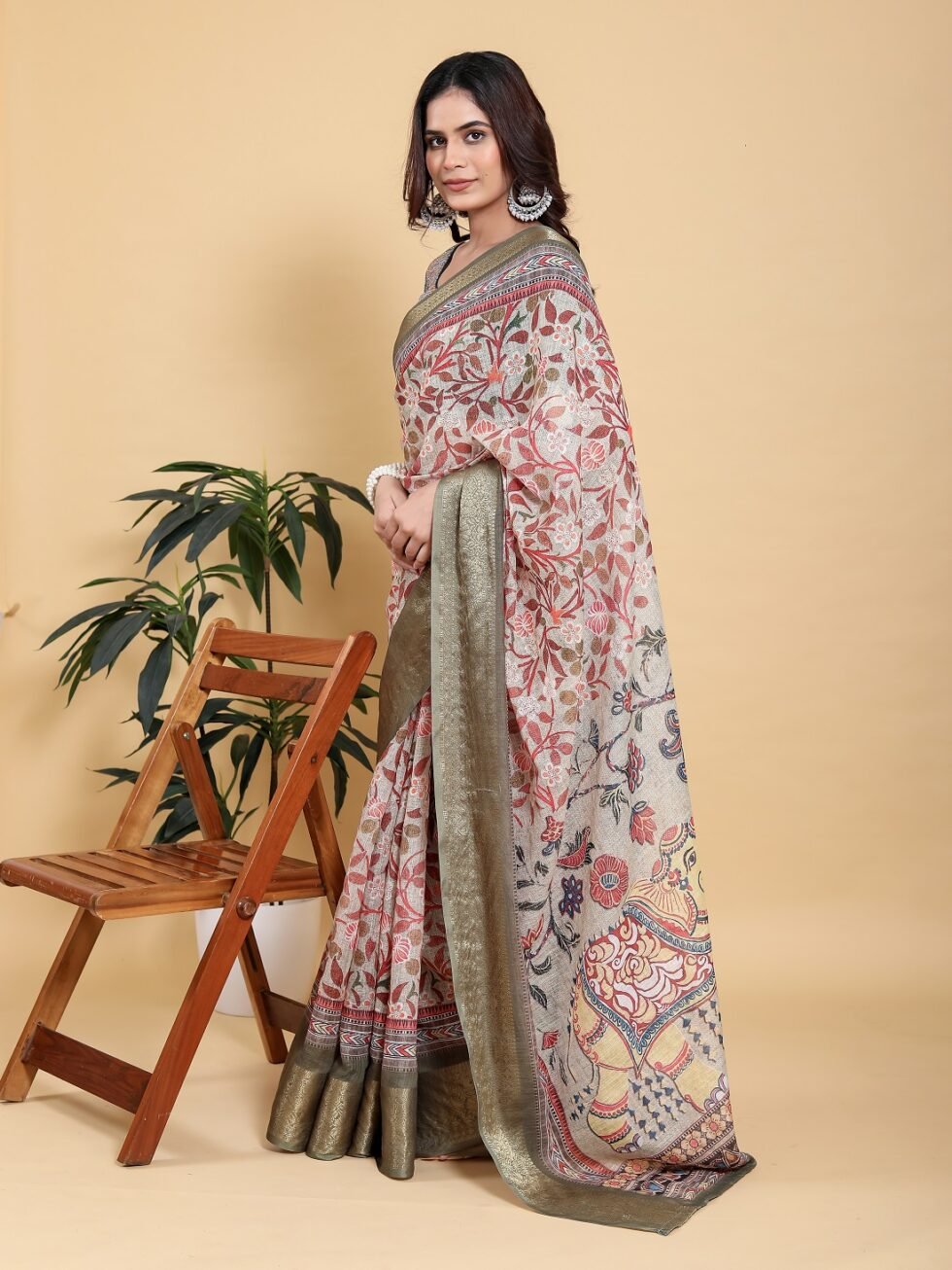 Showcase sophisticated elegance with this beautiful Light Beige Saree. Crafted from the Jacquard Patta Linen Cotton fabric, this piece features a serene base colour that allows the intricate print to shine. The saree is richly covered in a detailed digital print inspired by traditional Indian art, featuring flowers, foliage, and a prominent elephant motif on the pallu.