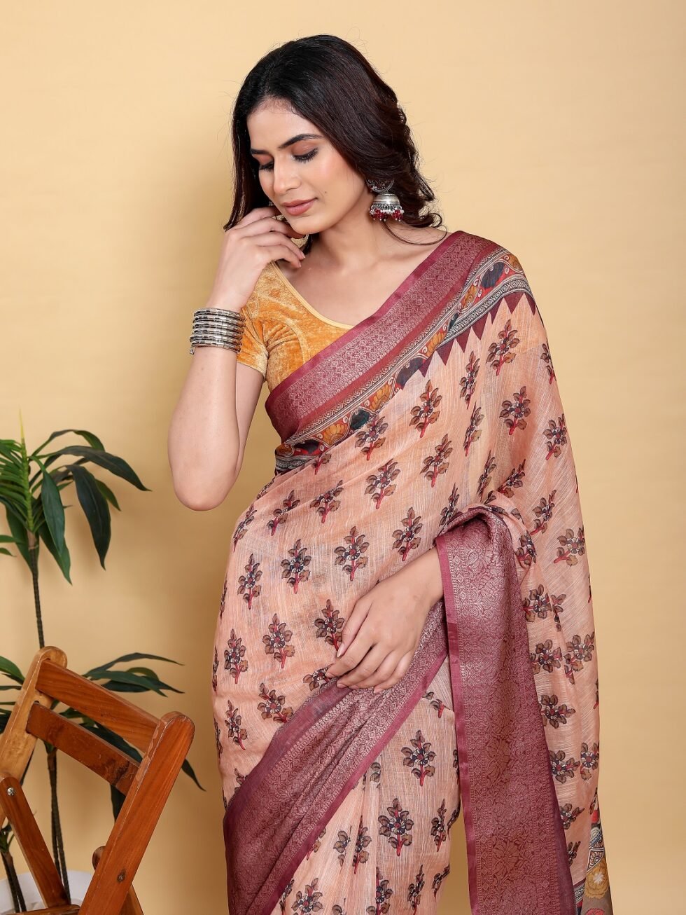 Embrace soft sophistication with this exquisite Peach/Coral Saree. It is crafted from the requested Jacquard Patta Linen Cotton fabric, offering comfort and structure. The gentle base color is adorned with a delicate multi-color digital floral print, lending a refined and graceful appearance.