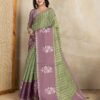 This graceful saree features a refreshing green base adorned with intricate ethnic patterns, beautifully complemented by a contrasting mauve pallu and border with delicate floral prints. Crafted from rich Erode Anmol Silk, it blends traditional elegance with a touch of contemporary style, perfect for festive gatherings.