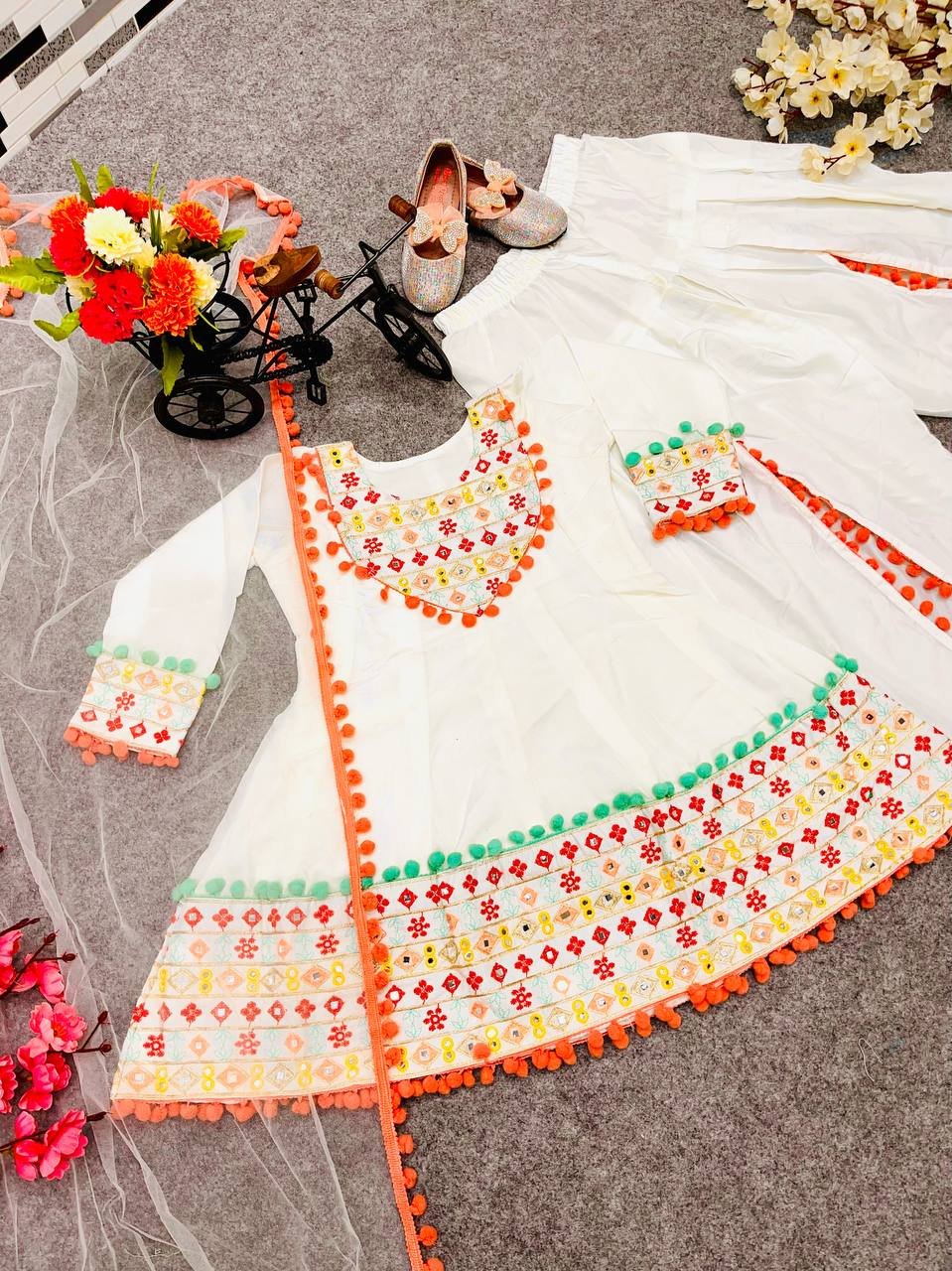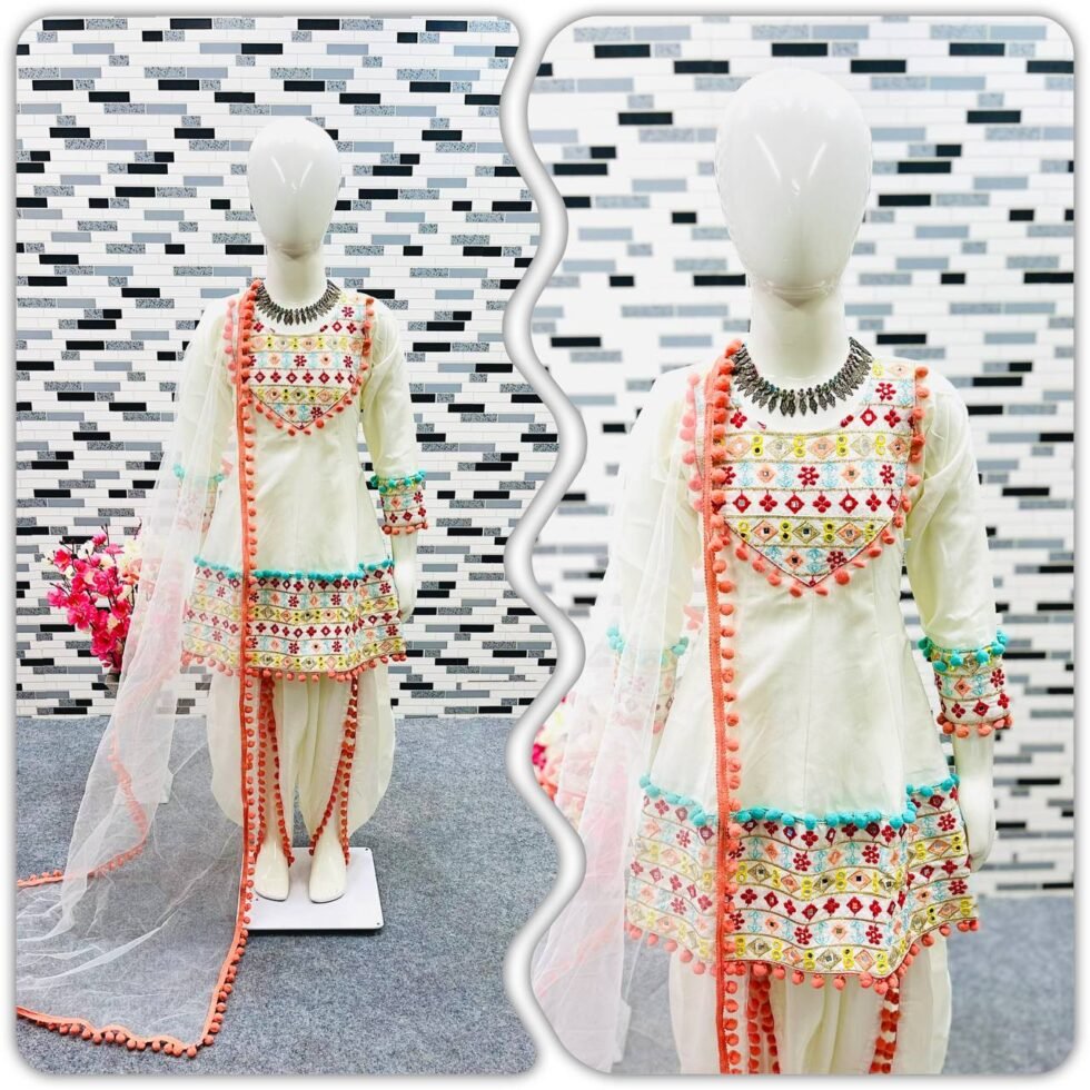 Girl’s Satin Embroidery Straight Kurta Dhoti With Dupatta