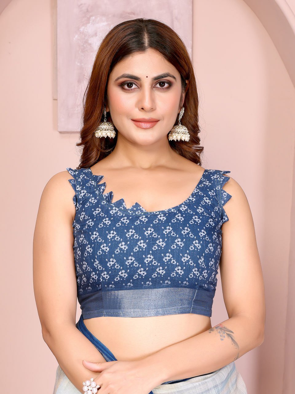 Elegant and refreshing, this pastel blue linen cotton saree features subtle checkered patterns paired with tropical leaf prints in soothing shades of blue, yellow, and green. The lightweight fabric ensures day-long comfort, making it ideal for both casual and festive occasions.
