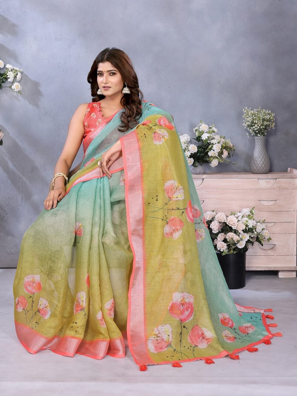 This refreshing saree in linen shimmer fabric features a soothing blend of green and aqua shades with delicate floral prints. The contrasting peach-pink border and tassel detailing add a touch of vibrance, making it a graceful choice for festive and casual occasions alike.
