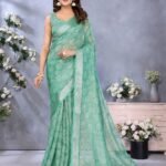 This elegant sea green saree features delicate woven floral and geometric motifs that exude timeless charm. Crafted from soft linen shimmer fabric, it offers a graceful drape and a subtle sheen, making it ideal for festive and traditional occasions.