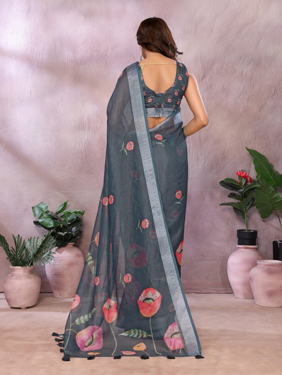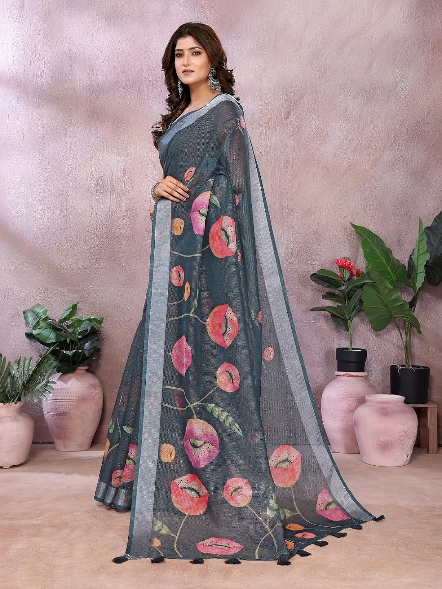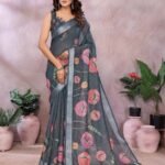 This elegant grey Linen Shimmer saree features a soft shimmer texture with vibrant floral prints in shades of pink and peach. Its subtle sheen adds a refined charm, making it a stylish choice for modern festive and traditional looks.