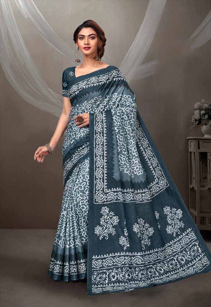 This is Cotton saree having Printed work on it. Cotton sarees are a staple of Indian traditional wear, known for their comfort, versatility, and durability. They are made from natural, breathable cotton fabric, making them ideal for various climates, especially hot and humid ones. Cotton sarees are versatile enough to be worn for everyday wear, formal occasions, and even special events.