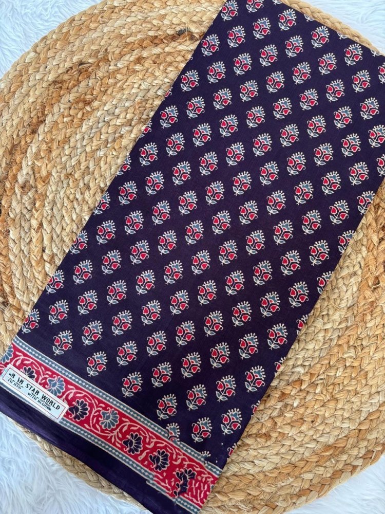 This is Cotton saree having Printed work on it. Cotton sarees are a staple of Indian traditional wear, known for their comfort, versatility, and durability. They are made from natural, breathable cotton fabric, making them ideal for various climates, especially hot and humid ones. Cotton sarees are versatile enough to be worn for everyday wear, formal occasions, and even special events.