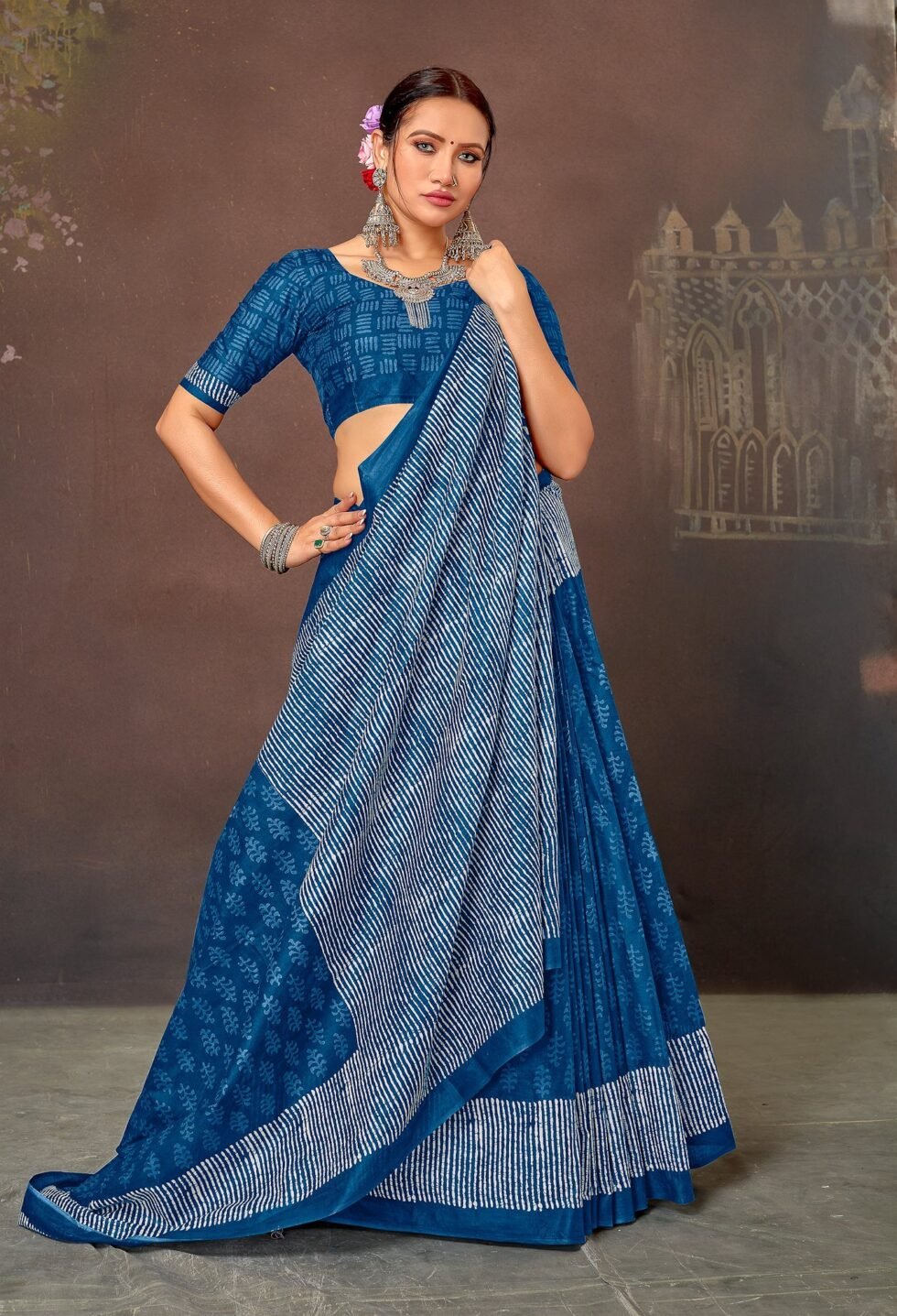 This is Cotton saree having Printed work on it. Cotton sarees are a staple of Indian traditional wear, known for their comfort, versatility, and durability. They are made from natural, breathable cotton fabric, making them ideal for various climates, especially hot and humid ones. Cotton sarees are versatile enough to be worn for everyday wear, formal occasions, and even special events.