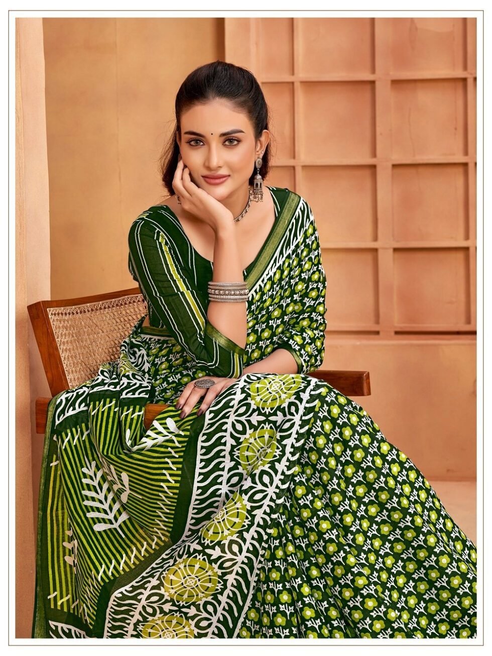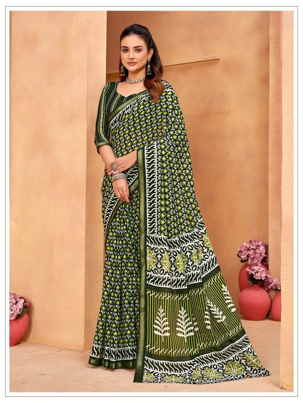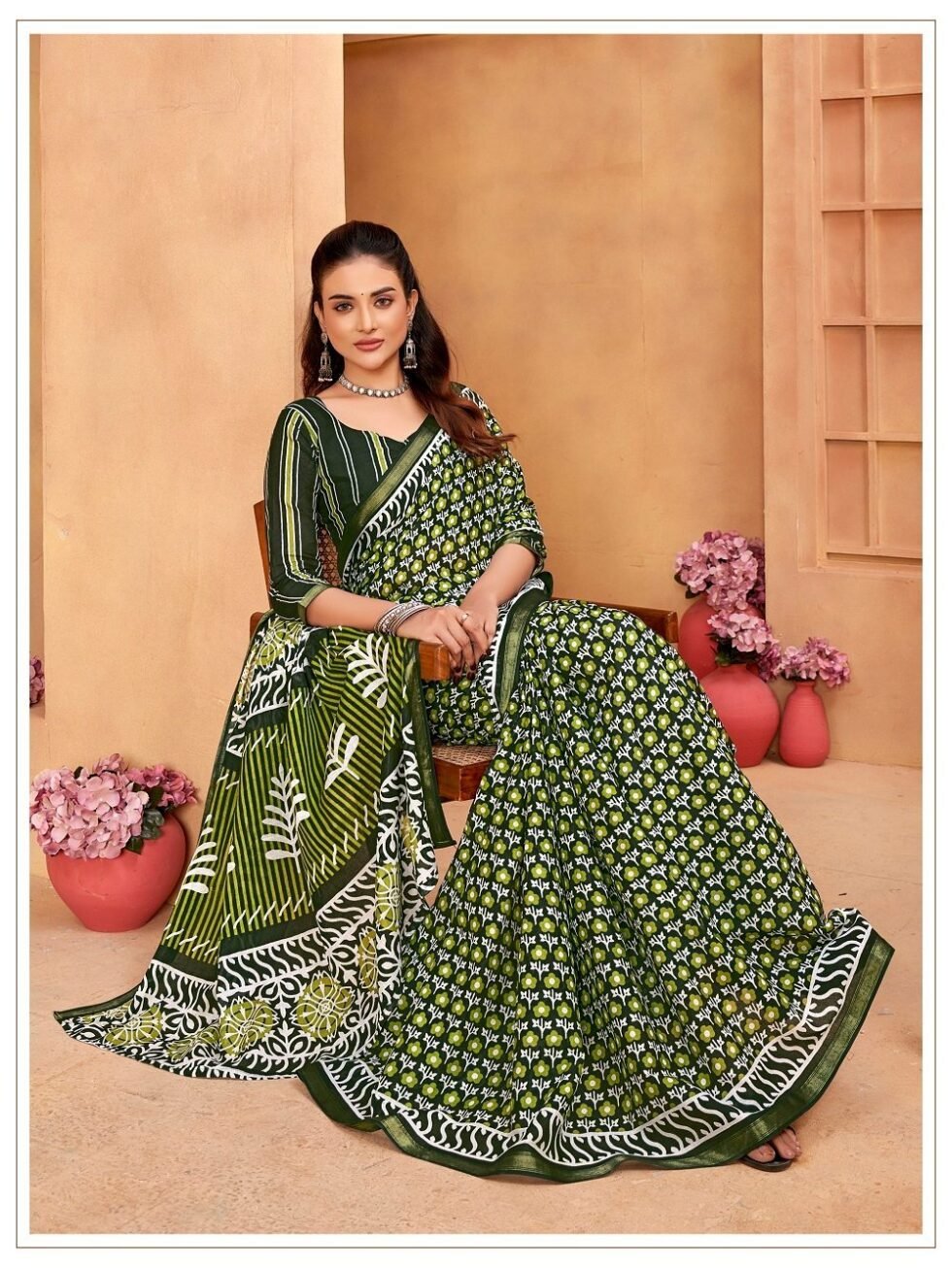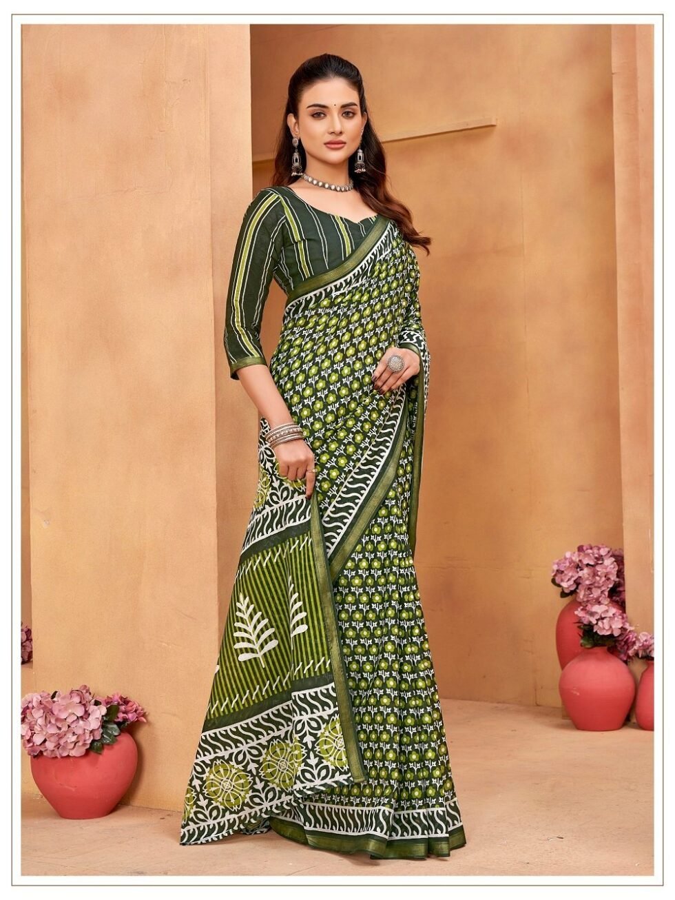 This is Cotton saree having Printed work on it. Cotton sarees are a staple of Indian traditional wear, known for their comfort, versatility, and durability. They are made from natural, breathable cotton fabric, making them ideal for various climates, especially hot and humid ones. Cotton sarees are versatile enough to be worn for everyday wear, formal occasions, and even special events.