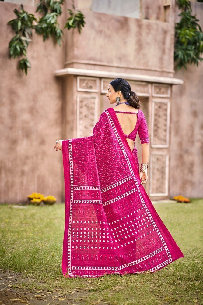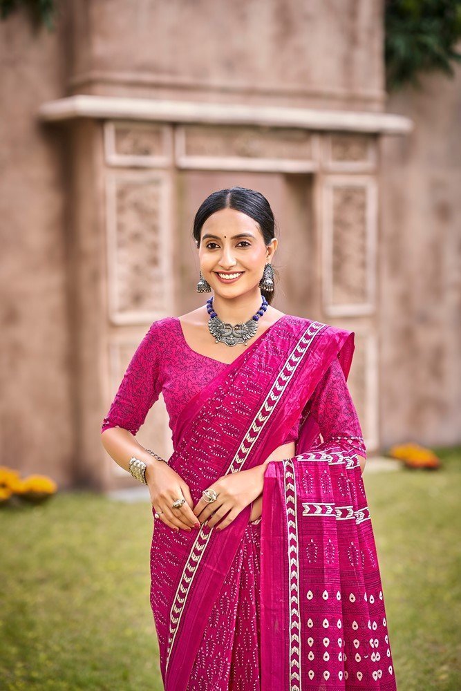 This is Cotton saree having Printed work on it. Cotton sarees are a staple of Indian traditional wear, known for their comfort, versatility, and durability. They are made from natural, breathable cotton fabric, making them ideal for various climates, especially hot and humid ones. Cotton sarees are versatile enough to be worn for everyday wear, formal occasions, and even special events.