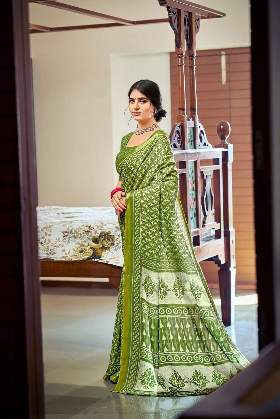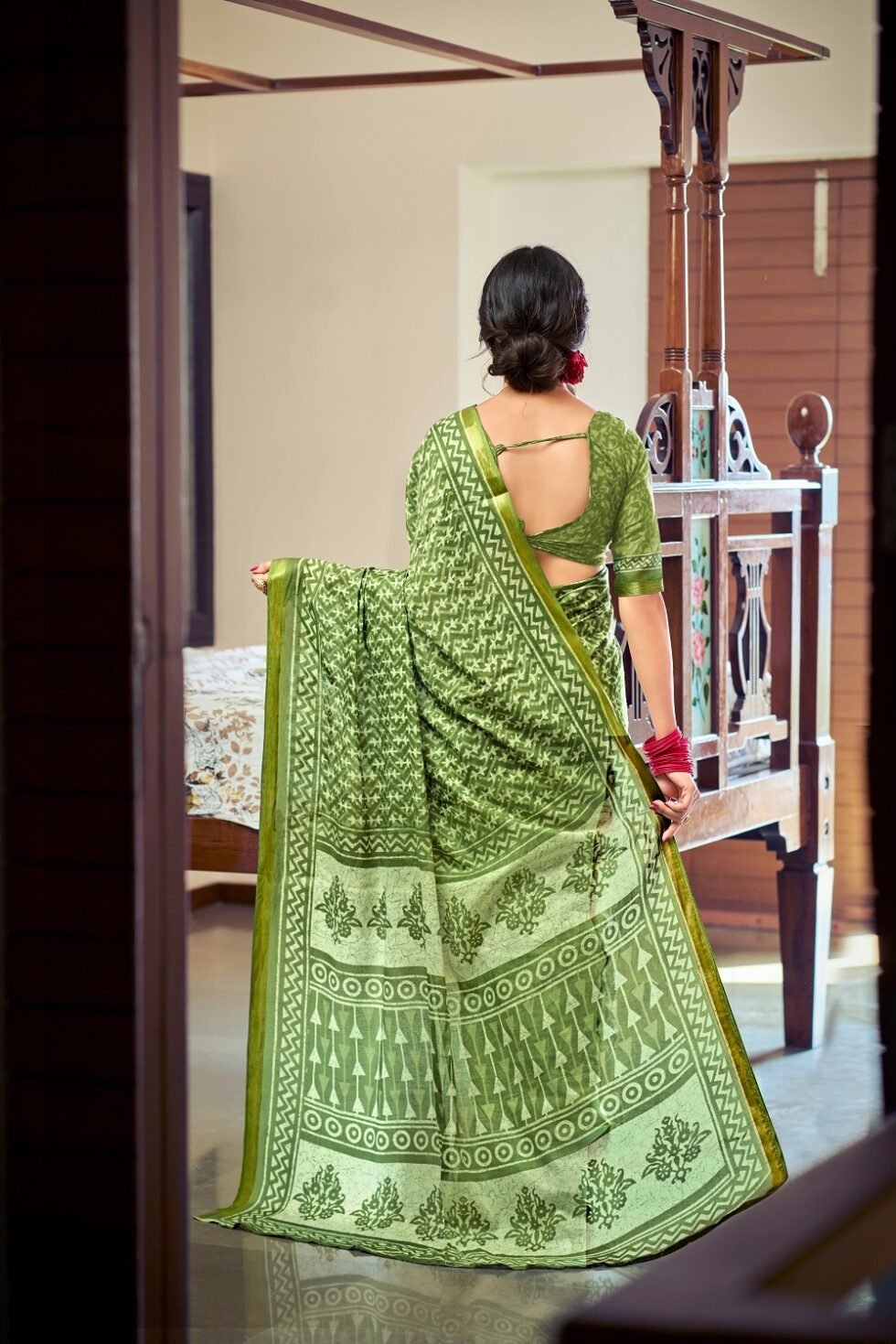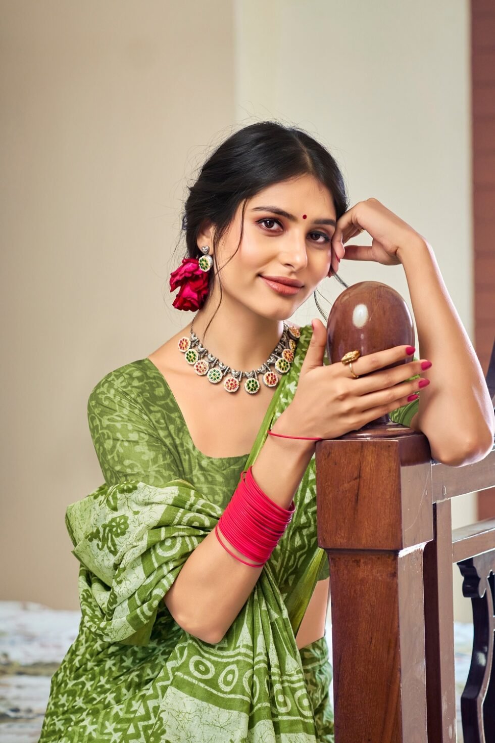 This is Cotton saree having Printed work on it. Cotton sarees are a staple of Indian traditional wear, known for their comfort, versatility, and durability. They are made from natural, breathable cotton fabric, making them ideal for various climates, especially hot and humid ones. Cotton sarees are versatile enough to be worn for everyday wear, formal occasions, and even special events.