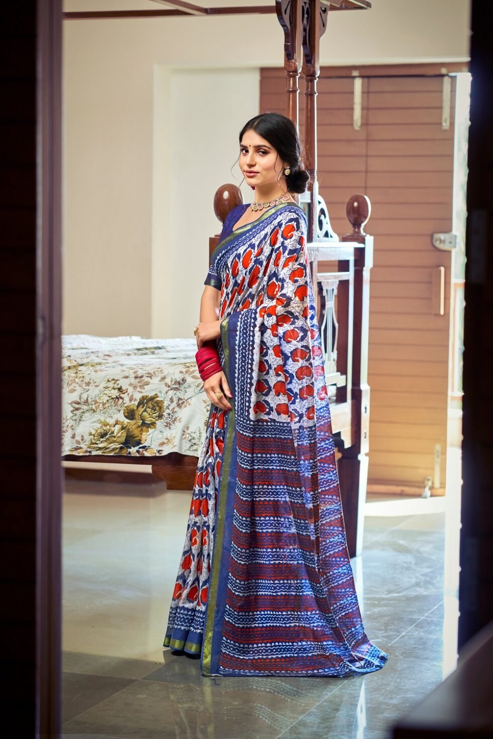 This is Cotton saree having Printed work on it. Cotton sarees are a staple of Indian traditional wear, known for their comfort, versatility, and durability. They are made from natural, breathable cotton fabric, making them ideal for various climates, especially hot and humid ones. Cotton sarees are versatile enough to be worn for everyday wear, formal occasions, and even special events.