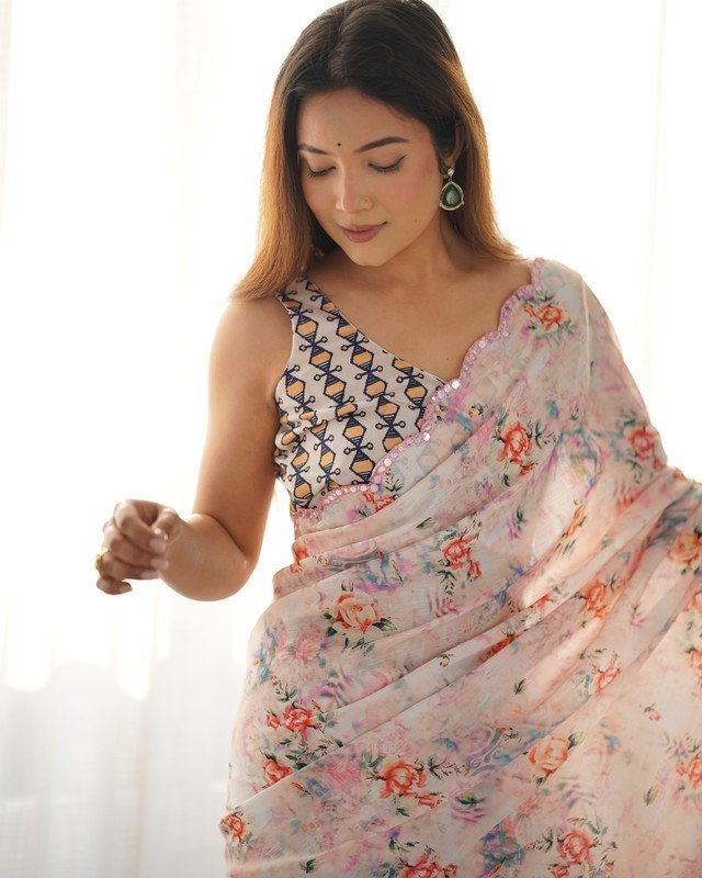 Malishka Export Mirror Lace Chinnon Beige Saree With Unstiched Blouse Piece