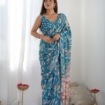 Malishka Export Mirror Lace Chinnon Blue Saree With Unstiched Blouse Piece