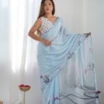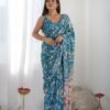 Malishka Export Mirror Lace Chinnon Light Blue Saree With Unstiched Blouse Piece