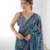 Malishka Export Mirror Lace Chinnon Sky Blue Saree With Unstiched Blouse Piece