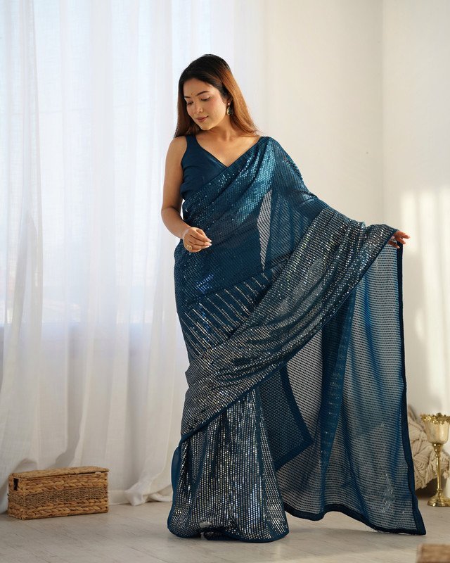 Malishka Export Sequance Georgette Petrol Saree With Unstiched Blouse Piece