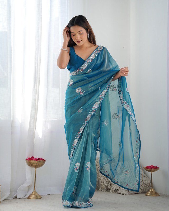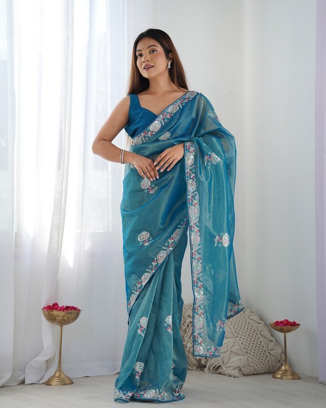 Malishka Export Sequance Twills Net Petrol Saree With Unstiched Blouse Piece