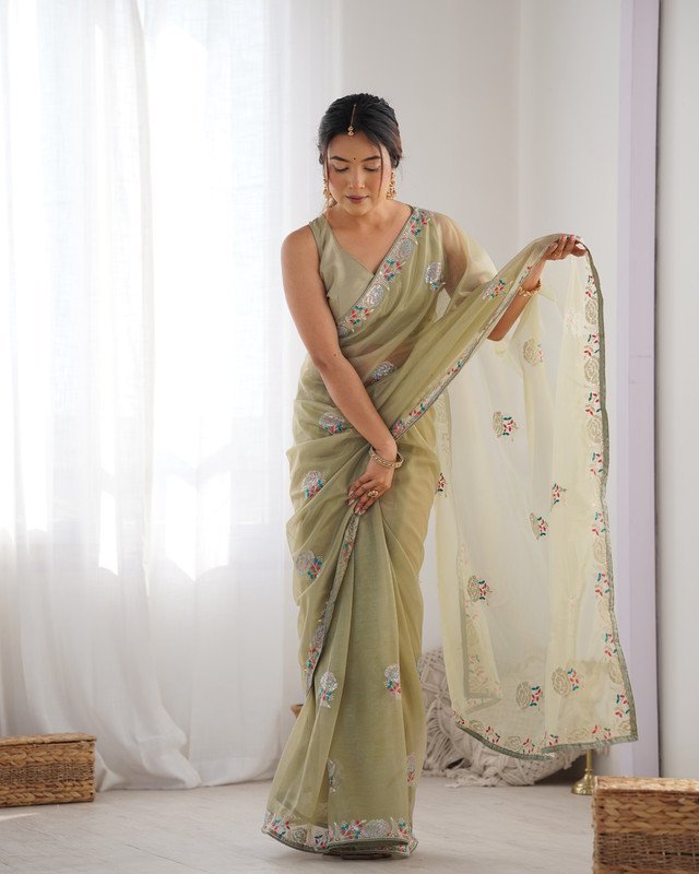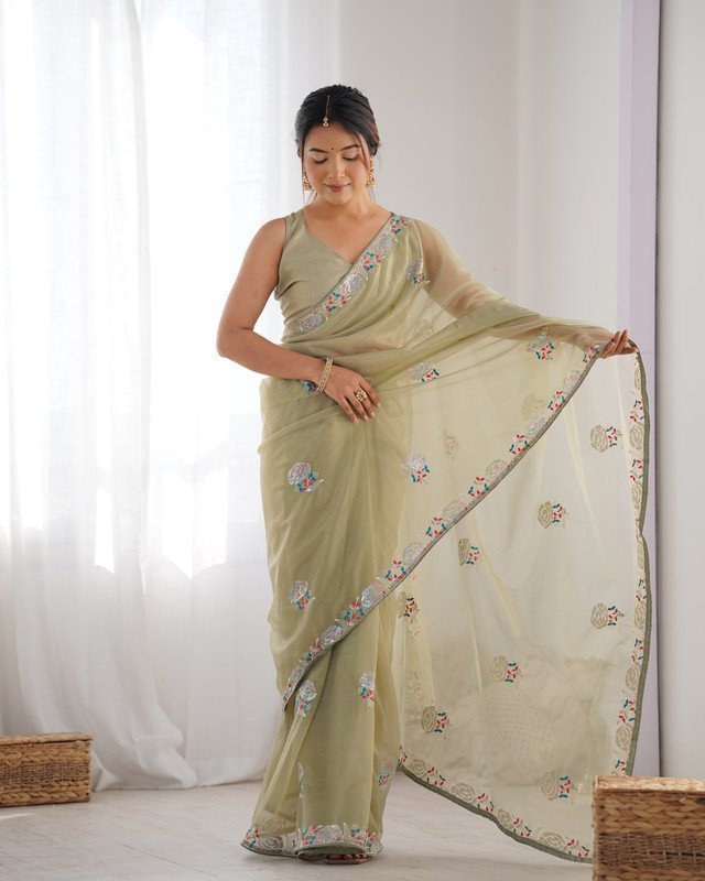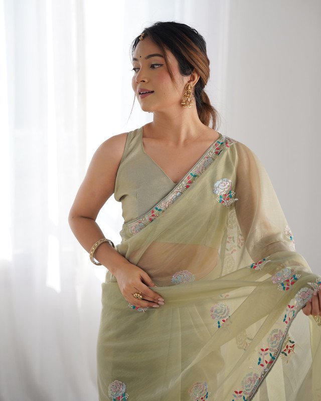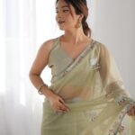 Malishka Export Sequance Twills Net Pista Saree With Unstiched Blouse Piece