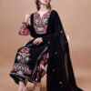 “*Our Exclusive Collection is here, to add a touch of tradition to your wardrobe.* *The Kurti and dupatta are made from Chinon fabric, which is selected for its drape, sheen, and ability to take prints and dyes. The garment is embellished with ston work, adding a traditional and sparkling touch. The overall design and color palette reflect the rich heritage of Indian ethnic wear.* *The garment is presented with decorative elements, such as flowers and a woven mat, enhancing its visual appeal.*