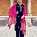 Malishka Export Women’s Navy Blue Velvet Embroidered Straight Kurta Pant With Dupatta