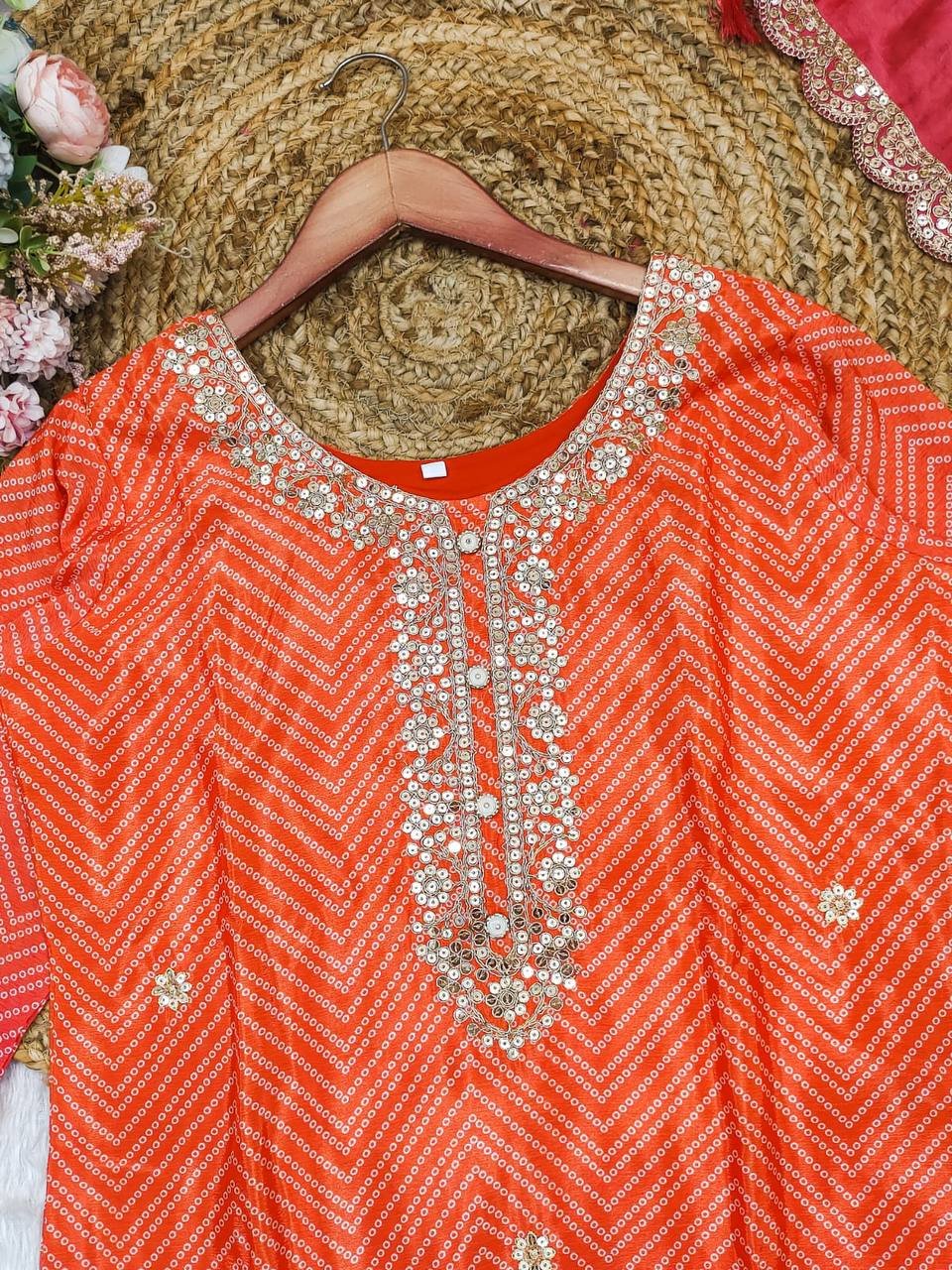 Featuring soothing yet?? Chinon bandhni print and full lining with santoon Pant and Chinon embroidery work dupatta with gotta pati work lace ??elegant printing ?? with Color. Multiprint and pettern. It is a perfect outfit for any small gathering or function. It is very comfortable as it looks ??????