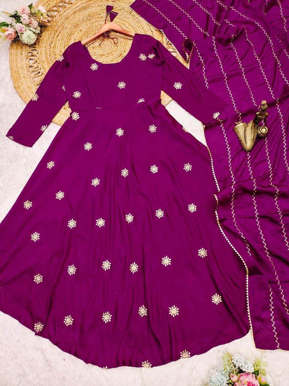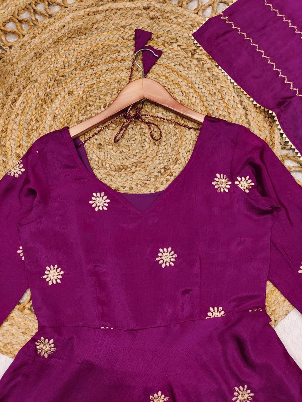 Malishka Export Women’s Wine Chinon Embroidered Anarkali Kurta With Dupatta