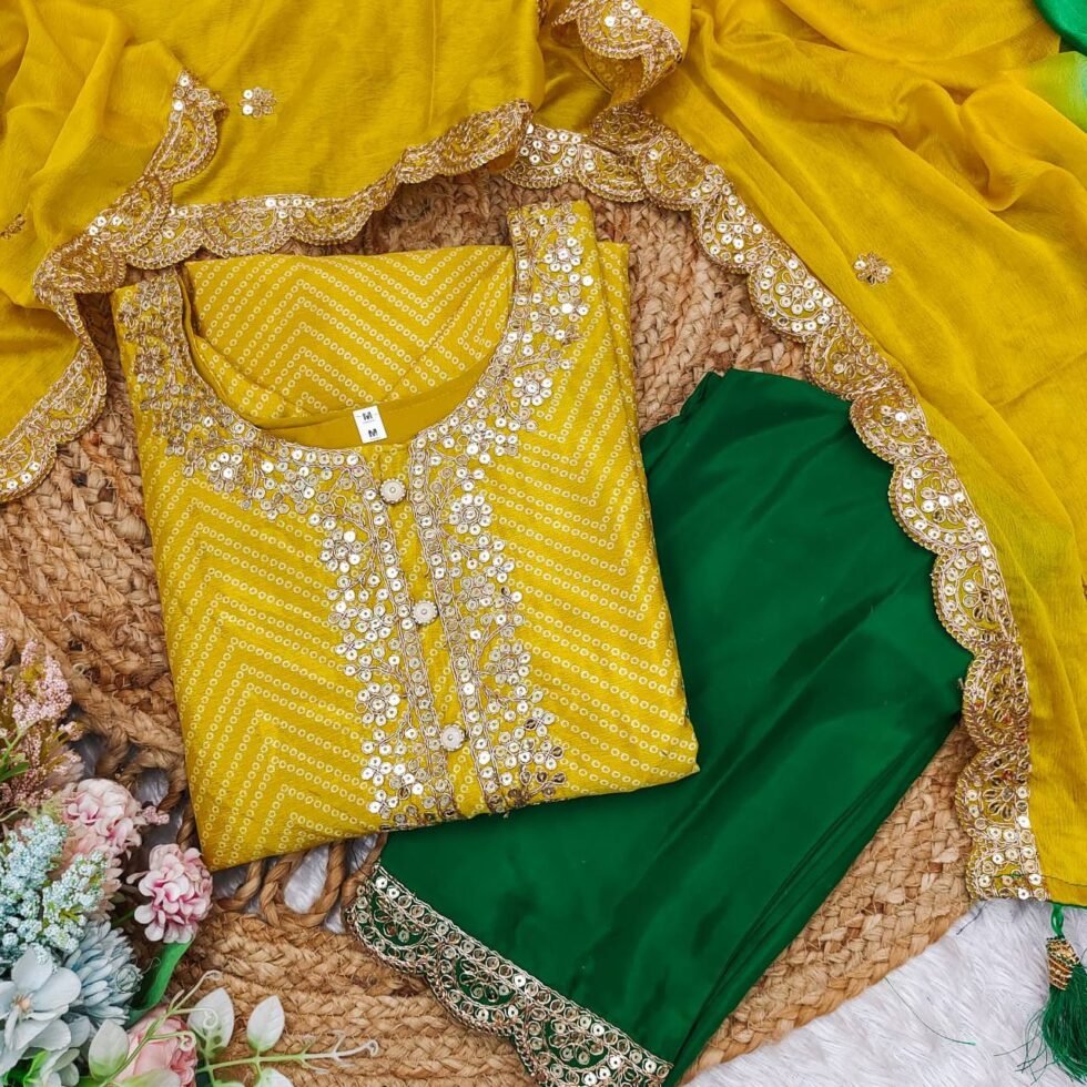Featuring soothing yet?? Chinon bandhni print and full lining with santoon Pant and Chinon embroidery work dupatta with gotta pati work lace ??elegant printing ?? with Color. Multiprint and pettern. It is a perfect outfit for any small gathering or function. It is very comfortable as it looks ??????