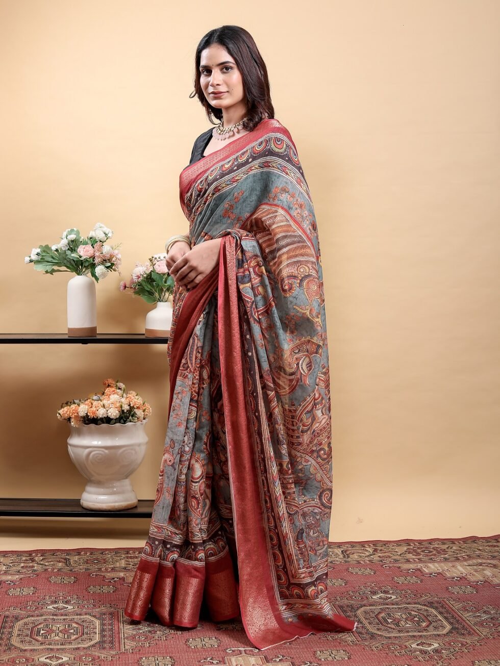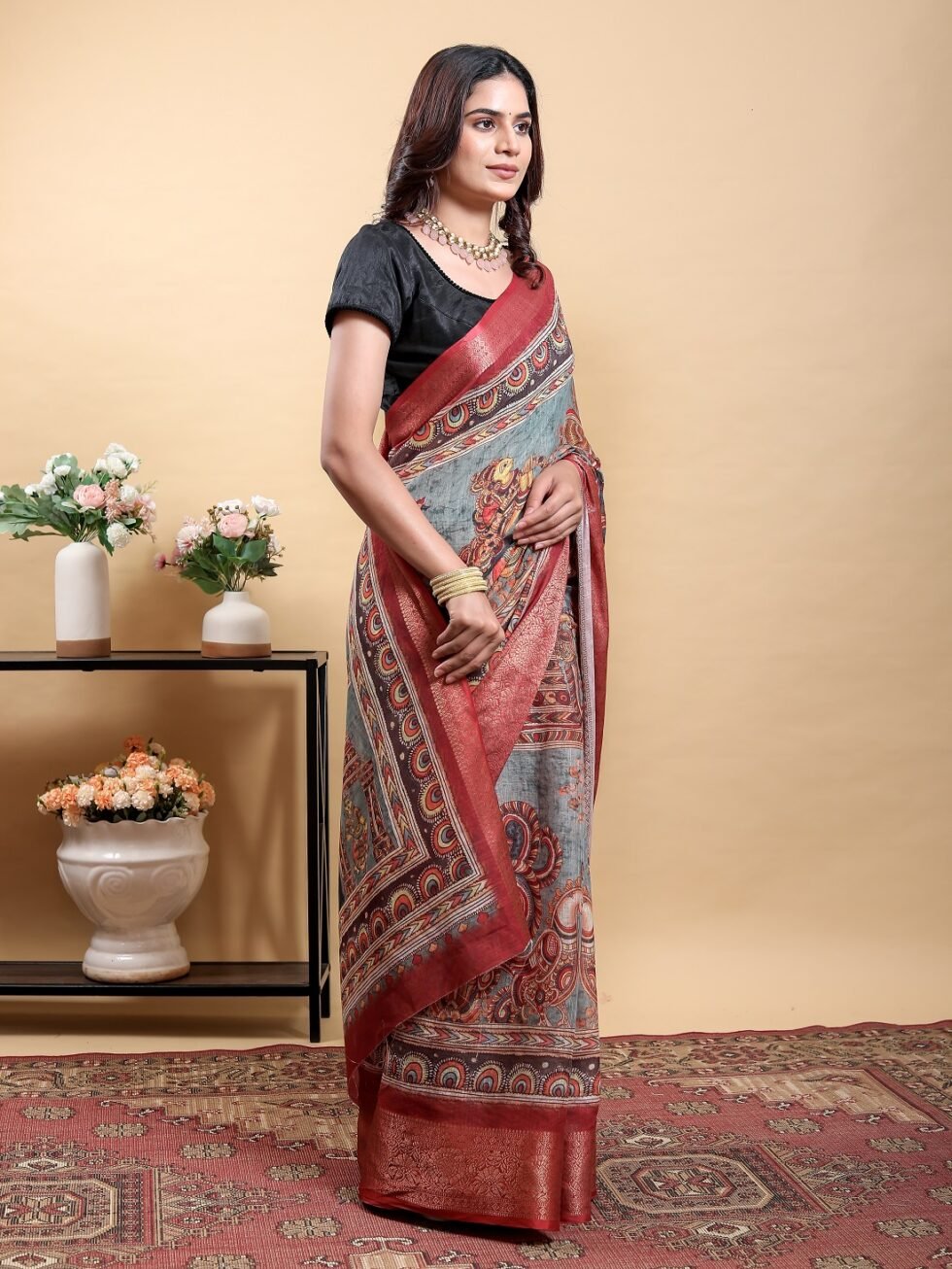 Capture the essence of heritage art with this stunning Light Grey/Blue Saree. Crafted from the durable Jacquard Patta Linen Cotton fabric, this piece showcases a subdued base color that serves as a canvas for the vivid print. The saree is covered in an elaborate digital print that beautifully merges Kalamkari motifs (flowers and birds) with bold Patola-inspired geometric patterns on the pallu.