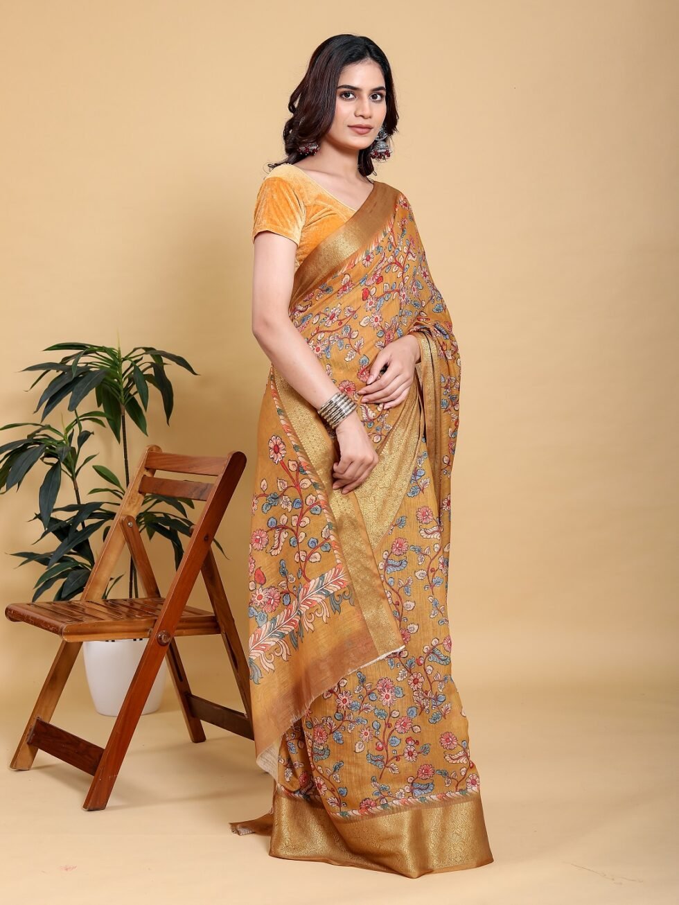 Malishka ExportElegant Mustard Yellow Floral Print Saree with Broad Zari Border With Blouse Piece